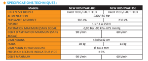 NEW HOSPIVAC 350 est un aspirateur chirurgical a alimentation électrigue 230V ~ / 50Hz, a utiliser pour l’aspiration des liquides corporels (comme par exemple mucus, catarrhe et sang) e lote de 4 roues antistatiques, dont deux avec un dispositif de freinage. Appareil désigné pour faciliter le transpor et l’usage continu.