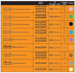 L’embase de la canule a une forme erponomique pour faciliter la manipulation pendant l’insertion et le retrait et un code couleur en fonction du diametre de la canule Lorifice latéral a l’extrémite de la canule permet d’assurer une injection dirigée du produit Méthode de stérilisation : Oxyde d’ethylene.